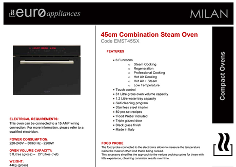 $1,012.00$1,729.00Unit price /UnavailableEuro Appliances EMST45SX 45cm Combination Steam Oven - Ex Display