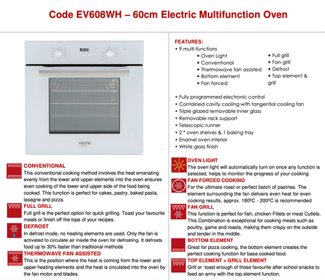 $888.00$1,399.00Unit price /UnavailableEuro Appliances EV608WH 60cm White Glass Electric Multifunction Oven