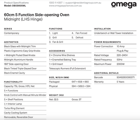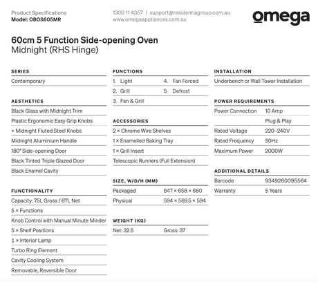 $1,099.00$2,749.00Unit price /UnavailableOmega OBOS605MR 60cm Black 5 Function Side-Opening Oven, Right Hinge