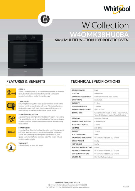 $800.00$2,056.00Unit price /UnavailableWhirlpool W4OMK38HU0BA 60cm Hydrolytic Multi-Function Oven in Black