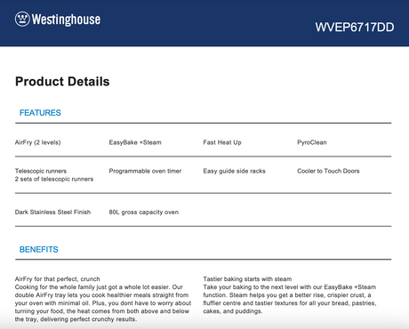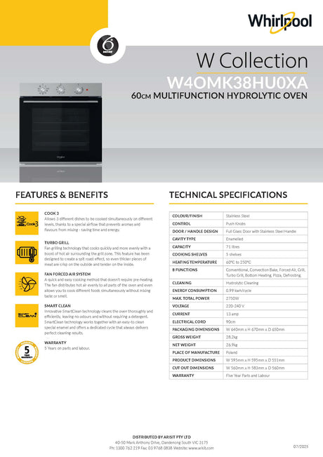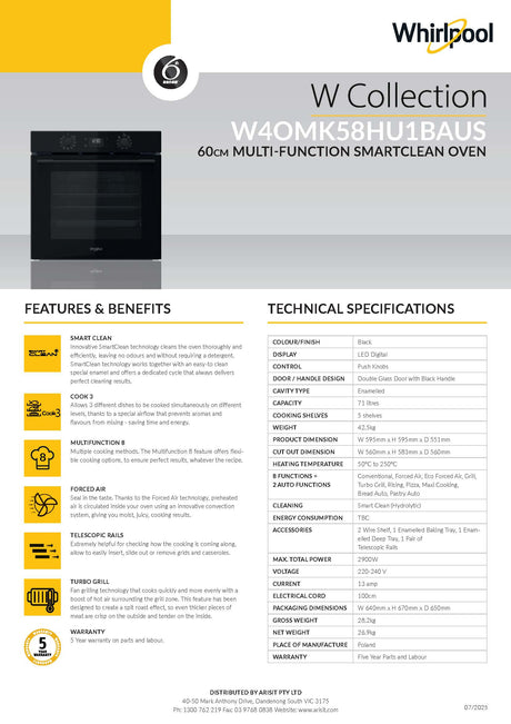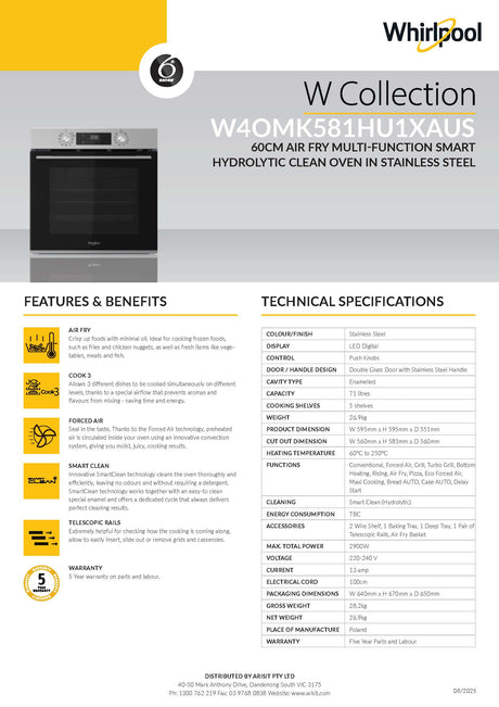 $949.00$1,499.00Unit price /UnavailableWhirlpool W4OMK581HU1XAUS 60cm Air Fry Multi Function Smart Hydrolytic Clean Oven in Stainless Steel