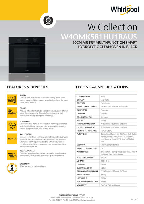$979.00Unit price /UnavailableWhirlpool W4OMK581HU1BAUS 60cm Air Fry Multi-Function Smart Hydrolytic Clean Oven in Black