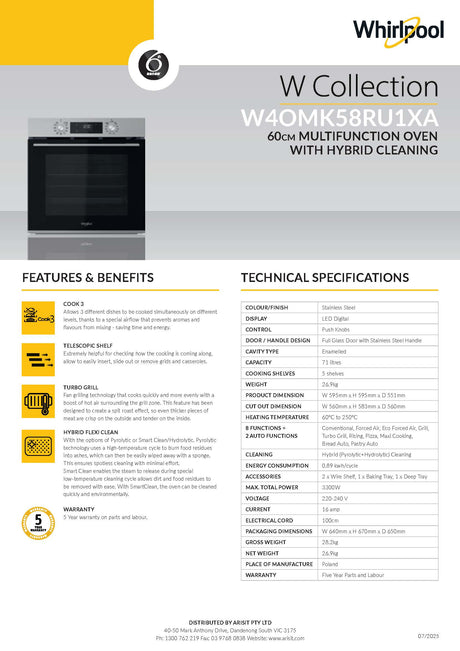 $1,290.00$1,899.00Unit price /UnavailableWhirlpool W4OMK58RU1XA 60cm Multi-Function Hybrid Hydrolytic/Pyrolytic Clean Oven in Stainless Steel