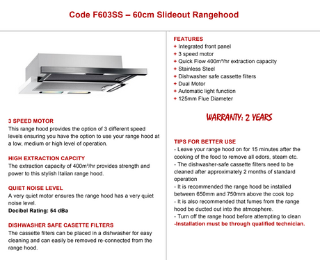 (Blanco BRS602X Replacement Rangehood) Euro Appliances E360S 60cm Italian Made Slide Out Range hood