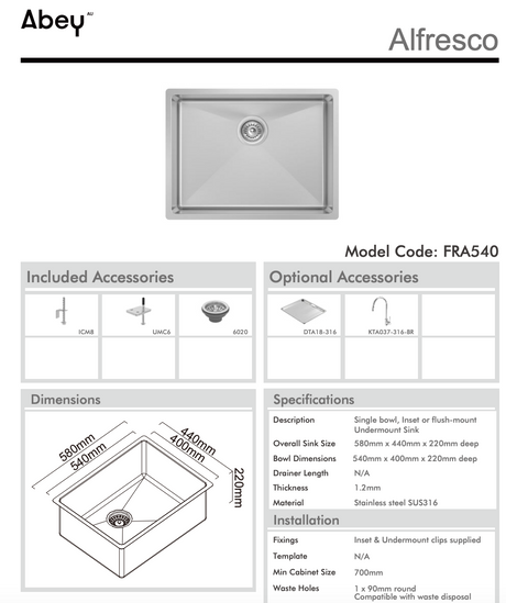 $1,979.00Unit price /Unavailable Abey Alfresco Sink 540mm 316 Marine Grade Stainless Steel, FRA540