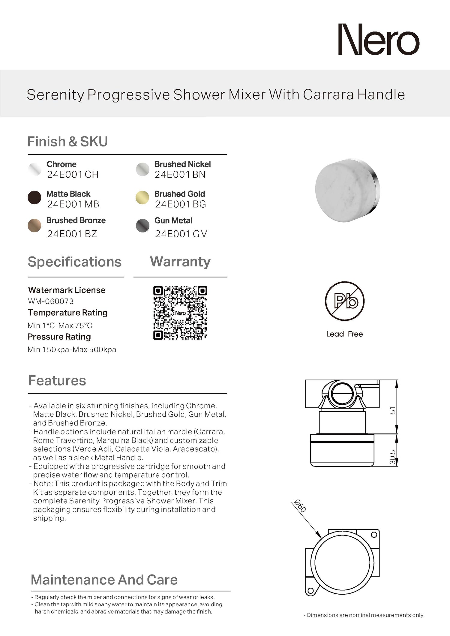 Nero Serenity Progressive Shower Mixer With Carrara Handle uses a progressive cartridge for intuitive single-handle adjustment of water flow and temperature.