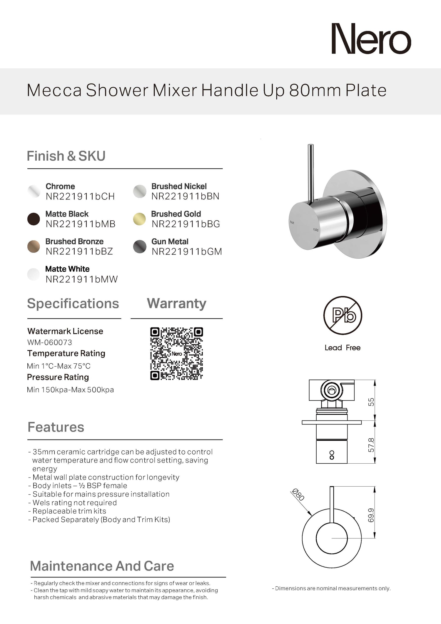 Nero Mecca Shower Mixer Handle Up Matte White NR221911BMW is backordered and will ship as soon as it is back in stock.