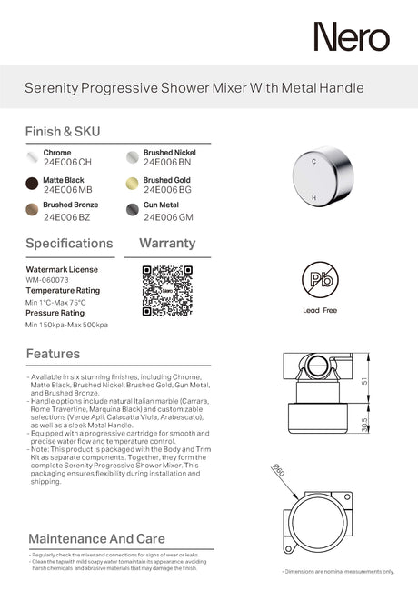 $234.00$313.50Unit price /UnavailableNero Serenity Progressive Shower Mixer w/ Metal Handle Chrome 24E006CH