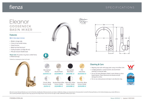 $275.00Unit price /UnavailableFienza Eleanor 202104BN-LF Gooseneck Brushed 202104BN Nickel Mixer with White Ceramic Handle