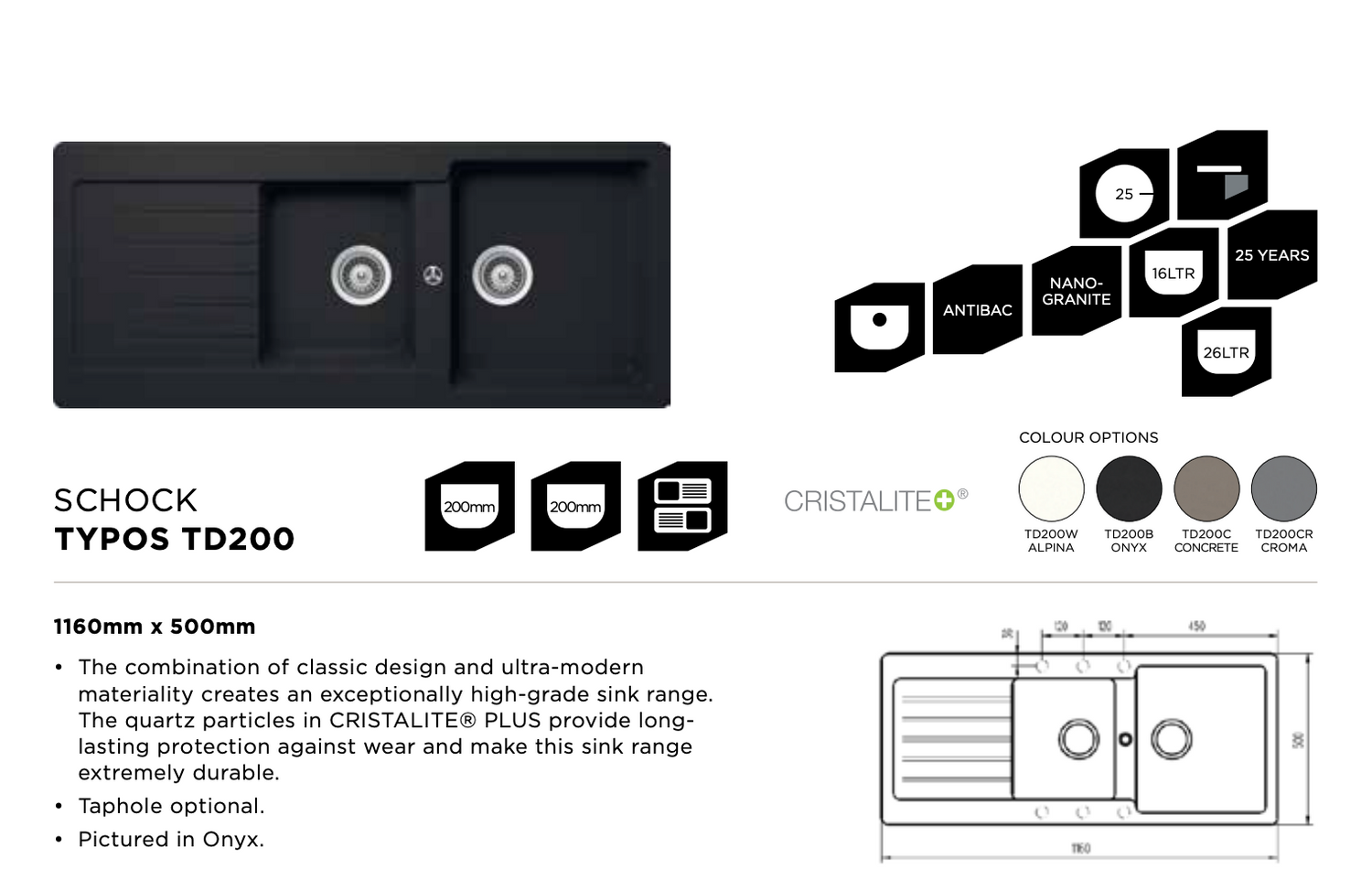 Abey TD200BR Schock Typos 1 & 3/4 Bowl with Drainer - Special Order
