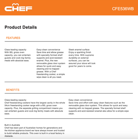 $649.00$1,899.00Unit price /UnavailableChef CFE536WB 54cm Freestanding Conventional Electric Oven/Stove - Seconds Discount