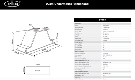 $499.00$1,319.00Unit price /UnavailableBelling BU90B 90cm Black and Steel Undermount Rangehood