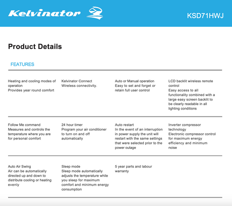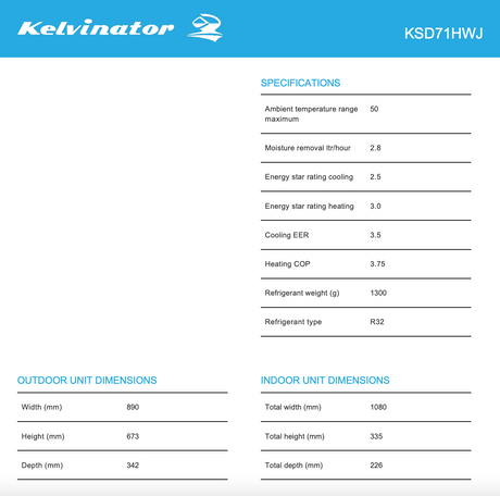 $1,699.00Unit price /Unavailable Kelvinator KSD71HWJ 7.1kW Split System Reverse Cycle Inverter Air Conditioner