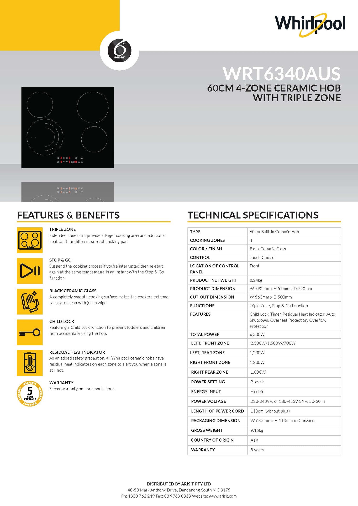 Whirlpool WRT6340AUS 60cm 4 Zone Ceramic Cooktop with Triple Zone is backordered and will ship as soon as it is back in stock.