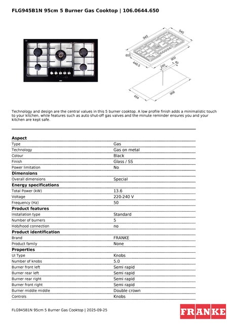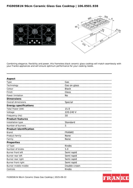 $2,777.00$3,499.00Unit price /UnavailableFranke FIG905B1N 96cm 5 Burner Natural Gas Black Glass Cooktop