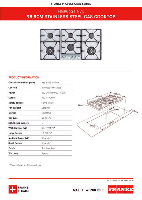 $2,999.00$3,493.00Unit price /UnavailableFranke FIG906S1N 98.5cm 6 Burner Stainless Steel Natural Gas Cooktop