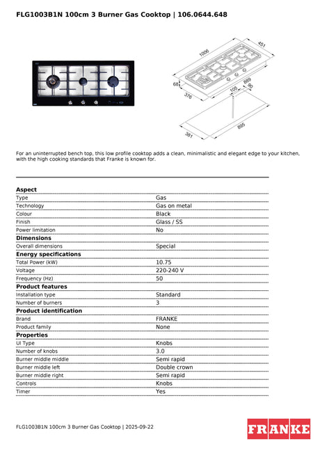$3,299.00$3,625.00Unit price /UnavailableFranke FLG1003B1N 3 Burner Natural Gas Black Glass and Stainless Steel Cooktop