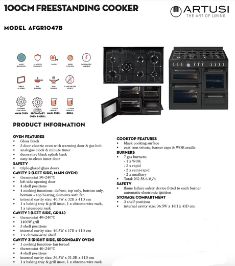$1,899.00$3,999.00Unit price /UnavailableArtusi AFGR1047B 100cm Dual Fuel Freestanding Stove, Black