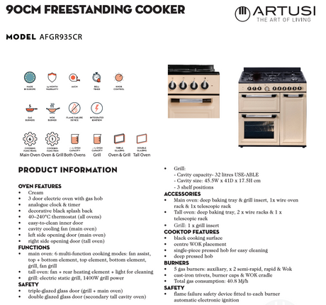 $3,499.00$4,549.00Unit price /UnavailableArtusi AFGR935CR Freestanding Cooker 90cm with Gas Hob, Cream