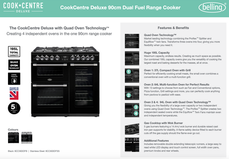 $1,499.00$2,099.00Unit price /UnavailableBelling BCC900DFB CookCentre Deluxe 90cm Dual Fuel Range Cooker, Black