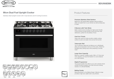 $1,199.00$1,899.00Unit price /UnavailableBelling BDU958DBK 90cm Dual Fuel Upright Cooker, Black - Ex Display Discount