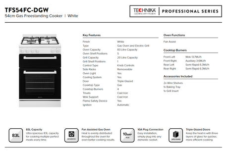 $2,569.00$2,799.00Unit price /UnavailableTechnika TFS54FC-DGW 54cm White Gas Upright Cooker