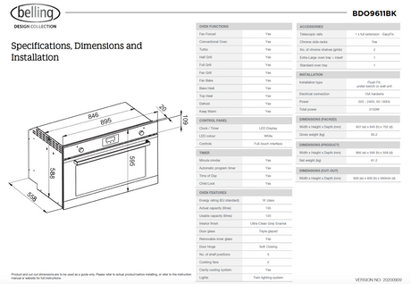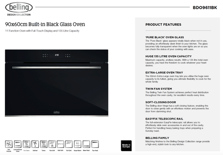 $2,499.00Unit price /Unavailable Belling BDO9611BK 90cm Built-in 8 Function Black Glass Oven - Made in Italy