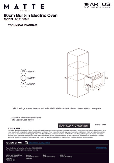$2,023.00$2,299.00Unit price /UnavailableArtusi AO9100MB 90cm Built-in Electric Oven