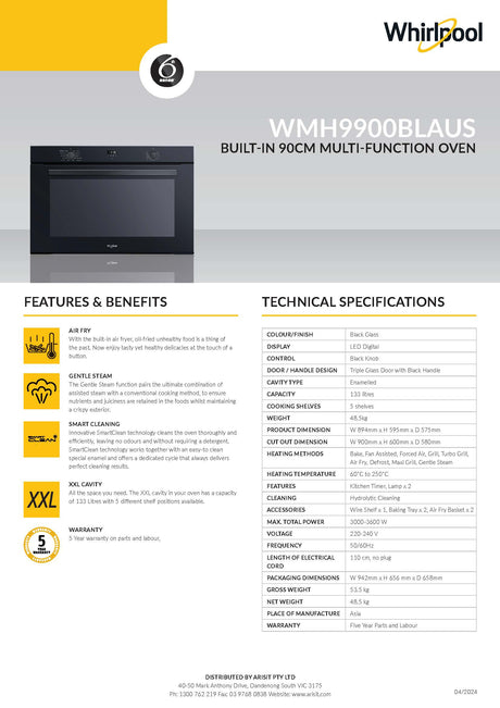$1,799.00$3,999.00Unit price /UnavailableWhirlpool WMH9900BLAUS 90cm Built In Multi-Function Oven with Air Fry