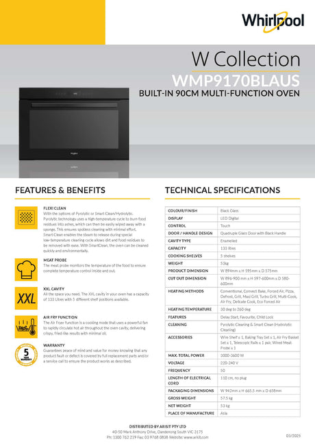 $2,073.00Unit price /UnavailableWhirlpool WMP9170BLAUS Built-In 90cm Multi-Function Pyrolytic Oven