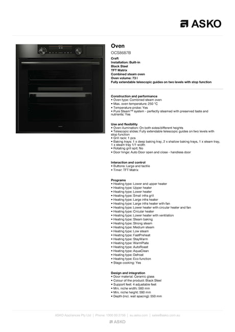 $2,299.00Unit price /UnavailableASKO 60cm Craft Built-In Combi-Steam Oven Black Steel OCS8687B - ASKO Seconds Discount