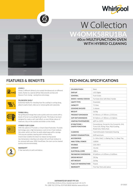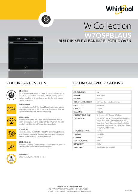 $1,519.00$2,299.00Unit price /UnavailableWhirlpool W4OMSK58RU1SBA 60cm Multi-function Gentle Steam & Pyrolytic Oven in Black