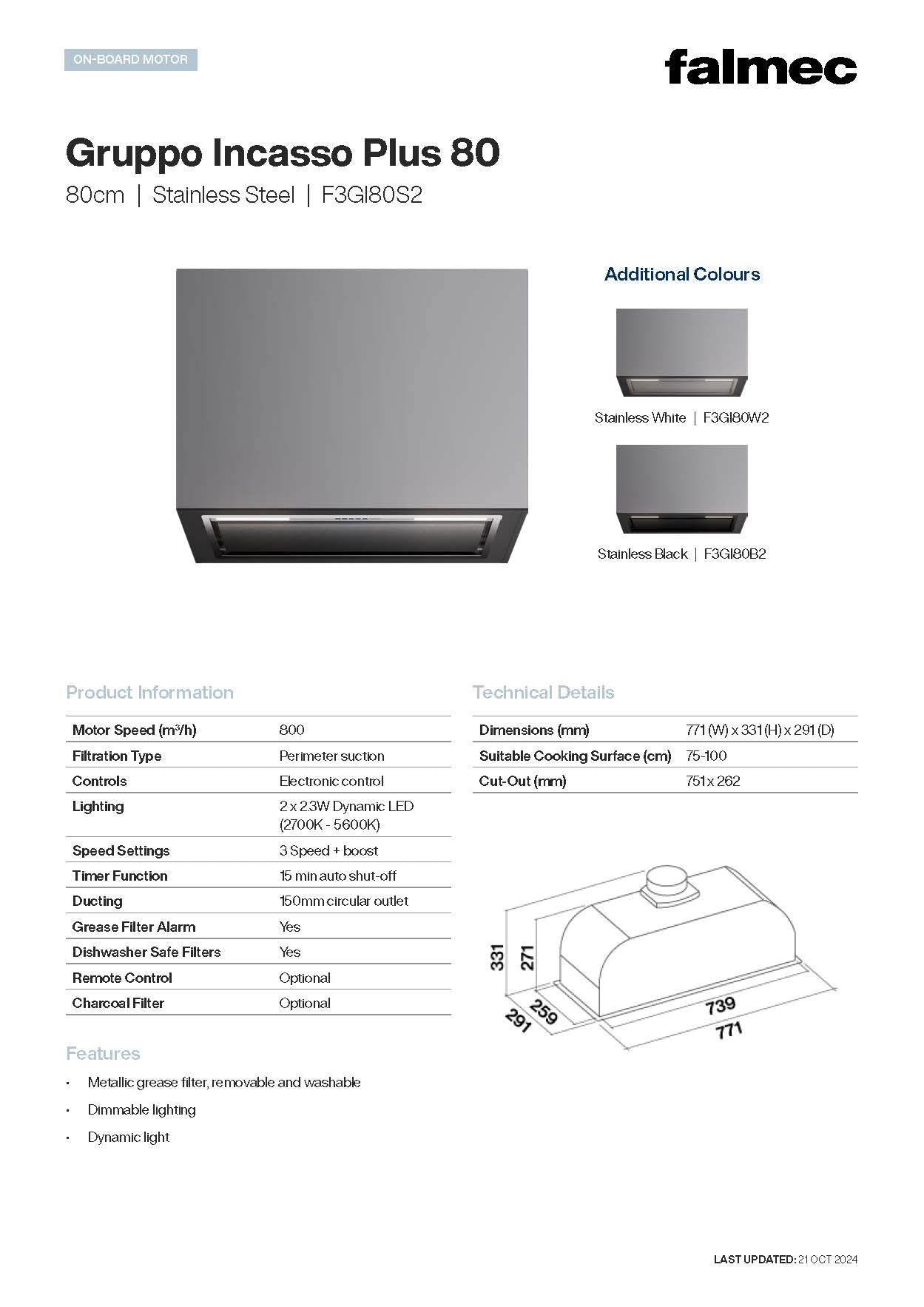 Falmec F3GI80W2 80cm Gruppo Incasso Concealed Rangehood, 800m3