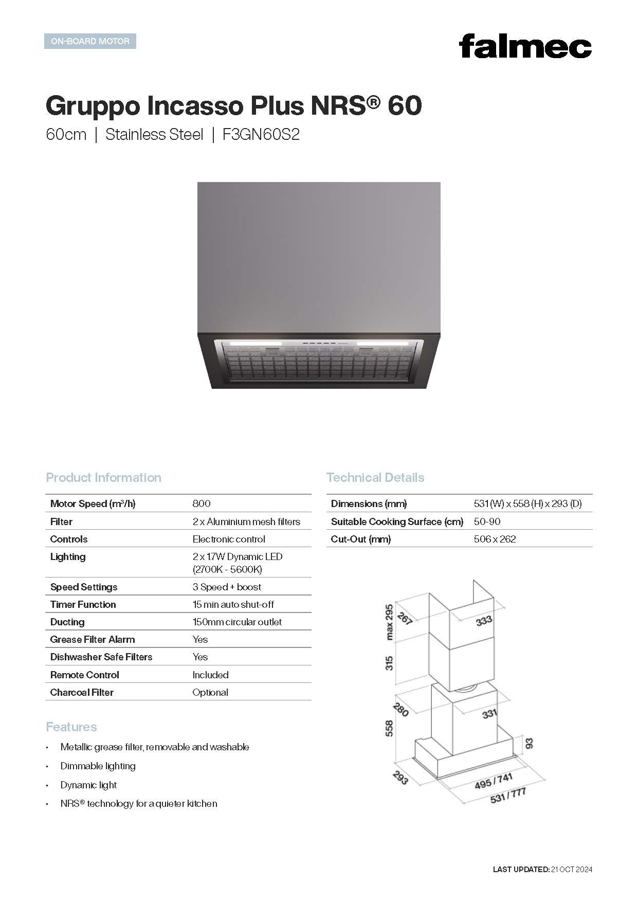 Falmec F3GN60S2 60cm Gruppo Incasso Plus NRS Undermount Rangehood, Stainless Steel, 800m3 is backordered and will ship as soon as it is back in stock.