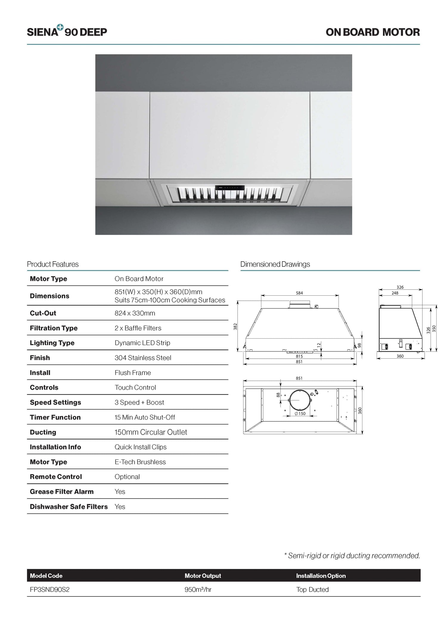 Falmec FP3SND90S2 90cm Siena+ Deep Under Cupboard Rangehood, Stainless Steel, 950m3 is backordered and will ship as soon as it is back in stock.