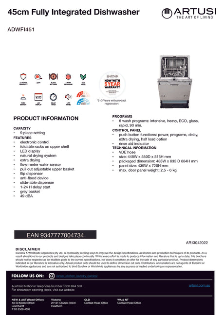 $879.00Unit price /UnavailableArtusi ADWFI451 45cm Fully Integrated Dishwasher