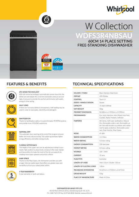 Whirlpool WDFS3R4NBSAU Maxi-Tub 14 Place Setting Freestanding Dishwasher in Black