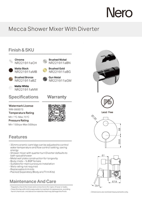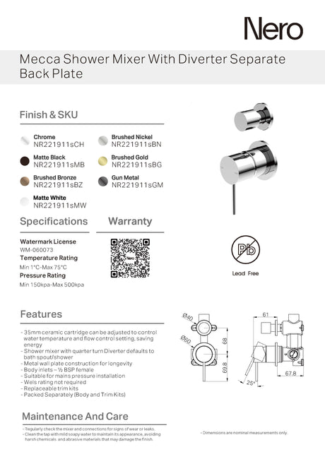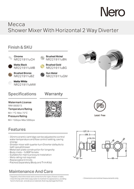 $214.00$286.00Unit price /UnavailableNero Mecca Shower Mixer With Divertor Separate Back Plate Chrome NR221911sCH