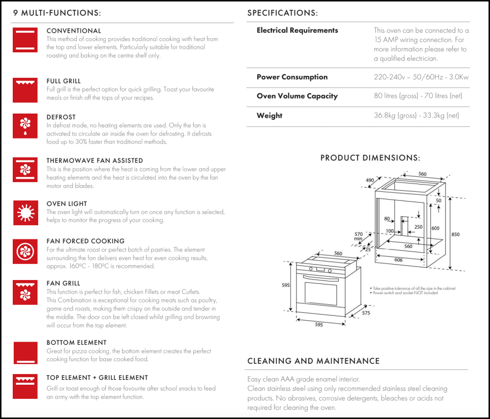 Oven Functions: fan forced, convection, bottom element, fan grill, grill, defrost & light