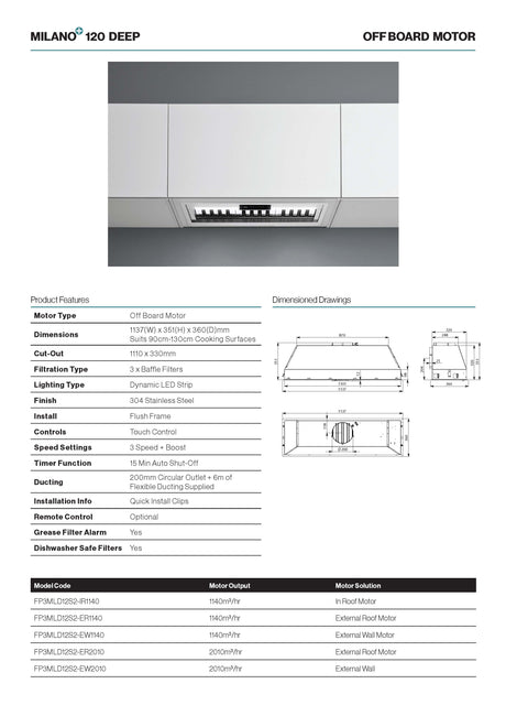 $3,399.00Unit price /UnavailableFalmec FP3MLD12S2-EW1140 Milano+ 120cm Deep Cupboard Rangehood with External Wall Motor