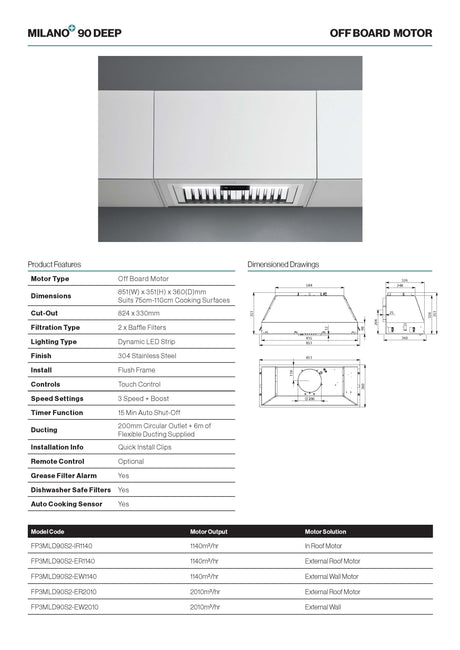 $3,139.00Unit price /UnavailableFalmec FP3MLD90S2-EW1140 90cm Milano+ Deep Undermount Rangehood with External Wall Motor