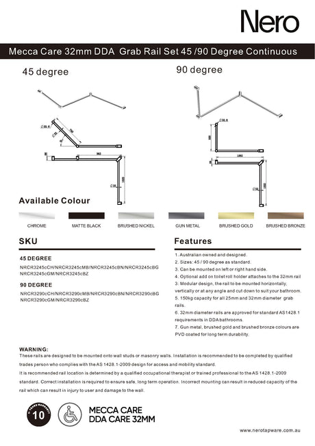 $381.65$449.00Unit price /UnavailableNero Mecca Care 32mm Dda Toilet Grab Rail Set 45 Degree Continuous 750X965X1025mm Chrome NRCR3245CCH