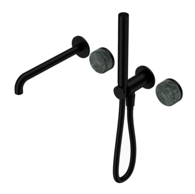 Nero Serenity Progressive Shower System and Spout – Verde Alpi Handle pairs a progressive mixer body with a dedicated trim kit, combining a 220 mm bath spout and a slim single-function metal hand shower for flexible showering and bathing in one set.