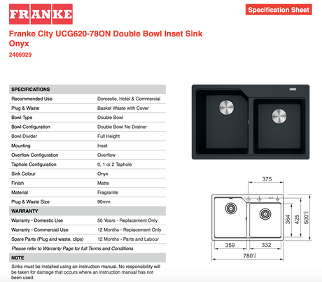 $1,048.00$1,309.00Unit price /UnavailableFranke Maris Granite Single Bowl 520mm Flushmount Onyx, MRG210-52B ON