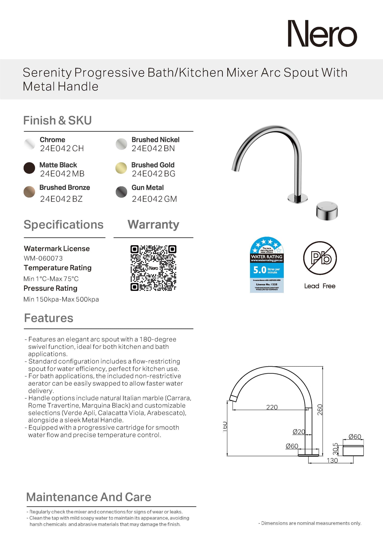 Nero Serenity Progressive Bath Mixer Arc Spout – Metal Handle uses a gracefully curved spout with 180‑degree swivel, giving ample reach and flexibility across sinks or baths while maintaining a clean, minimalist profile.