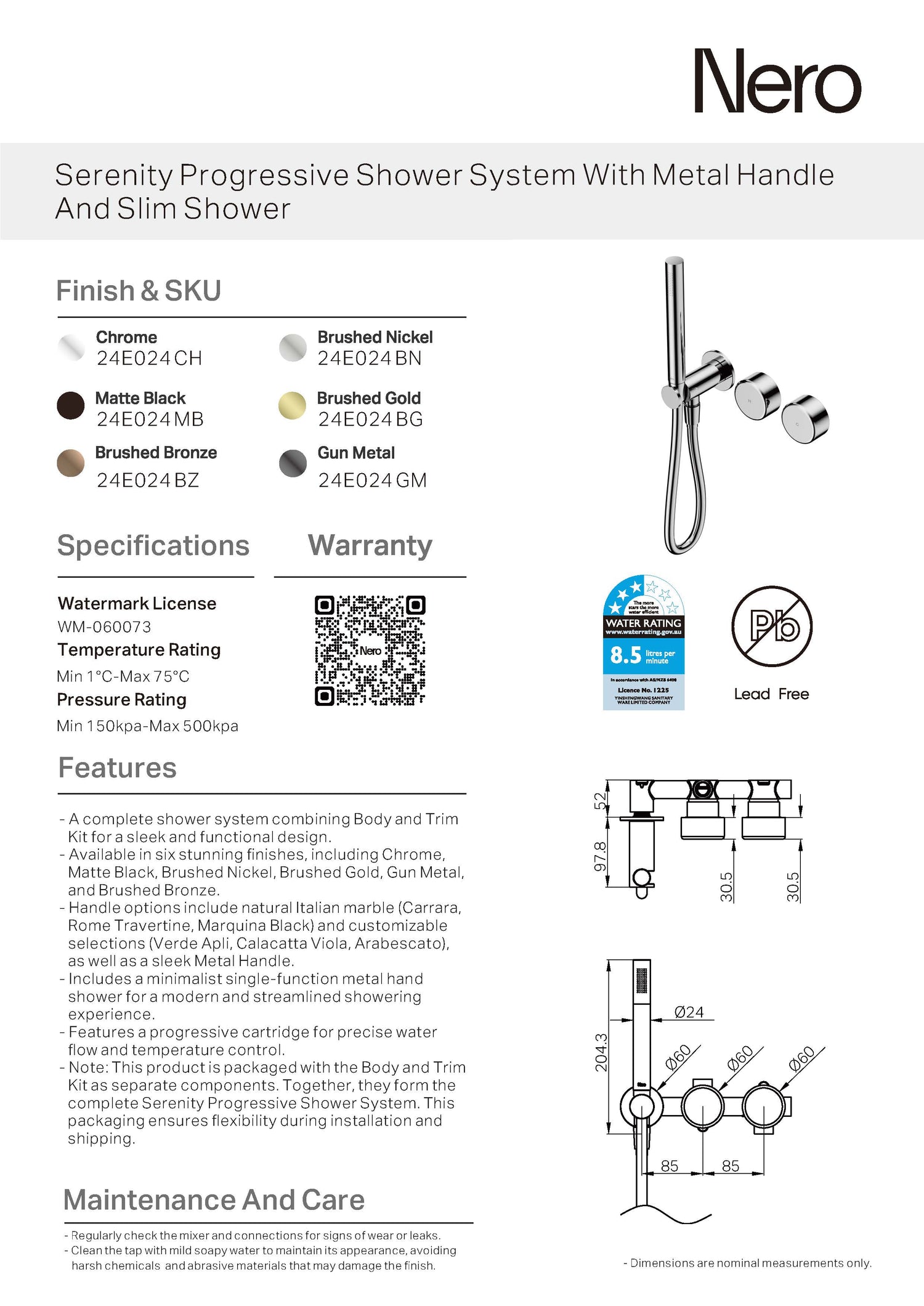 The Nero Serenity Progressive Slim Shower System – Metal Handle pairs a progressive mixer body with a separate trim kit, including a 220mm spout for bath filling and a three-function Serenity hand shower with seamless infinite switching for customised spray patterns.