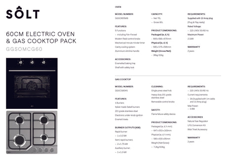 Solt GGSOMCG60 60cm Electric Oven & Gas Cooktop Bundle