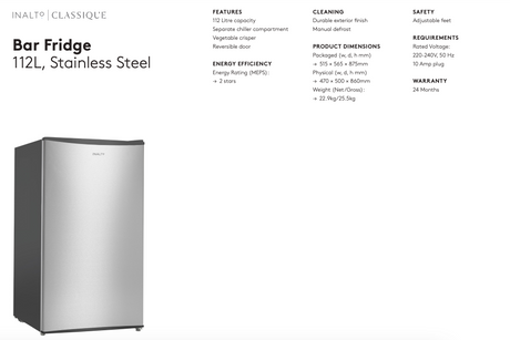 Inalto IBF112S 112 Litre Stainless Steel Bar Fridge - Online Only