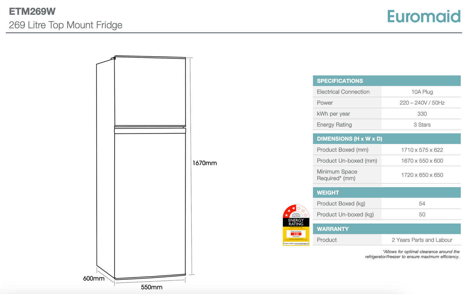 Euromaid 269L Stainless Steel Top Mount Fridge ETM269S - Ex Display Discount