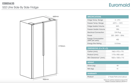 $890.00$1,499.00Unit price /UnavailableEuromaid ESBS563S 532L Side By Side Fridge, Stainless Steel - Online Only
